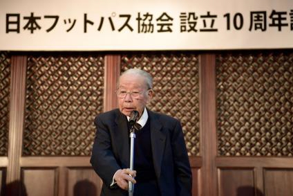 シンポジウムは会長の石阪町田市市長のご挨拶から始まりました。石阪会長は10年の間、各地で行われた例会に一度も不参加だったことがありません。その石阪市長が日本フットパス協会の「会長を引き受けたのは、日本の政界の重鎮である石原信雄氏が名誉会長になってくださった会だから」だそうですが、柿生に住んでおられる石原氏も小田急沿線などをよくウォーキングされておられ、フットパス協会の設立にも快く応援をしてくださいました。今回も93歳というご高齢をおして町田の会場まで来て、温かなご挨拶をくださいました。